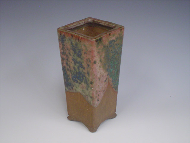 A squat blue green glazed square with cut feet. This is a body style of pot common to Tofukuji, often seen glazed with darker blues, the lighter blue green glaze here is a little less common.