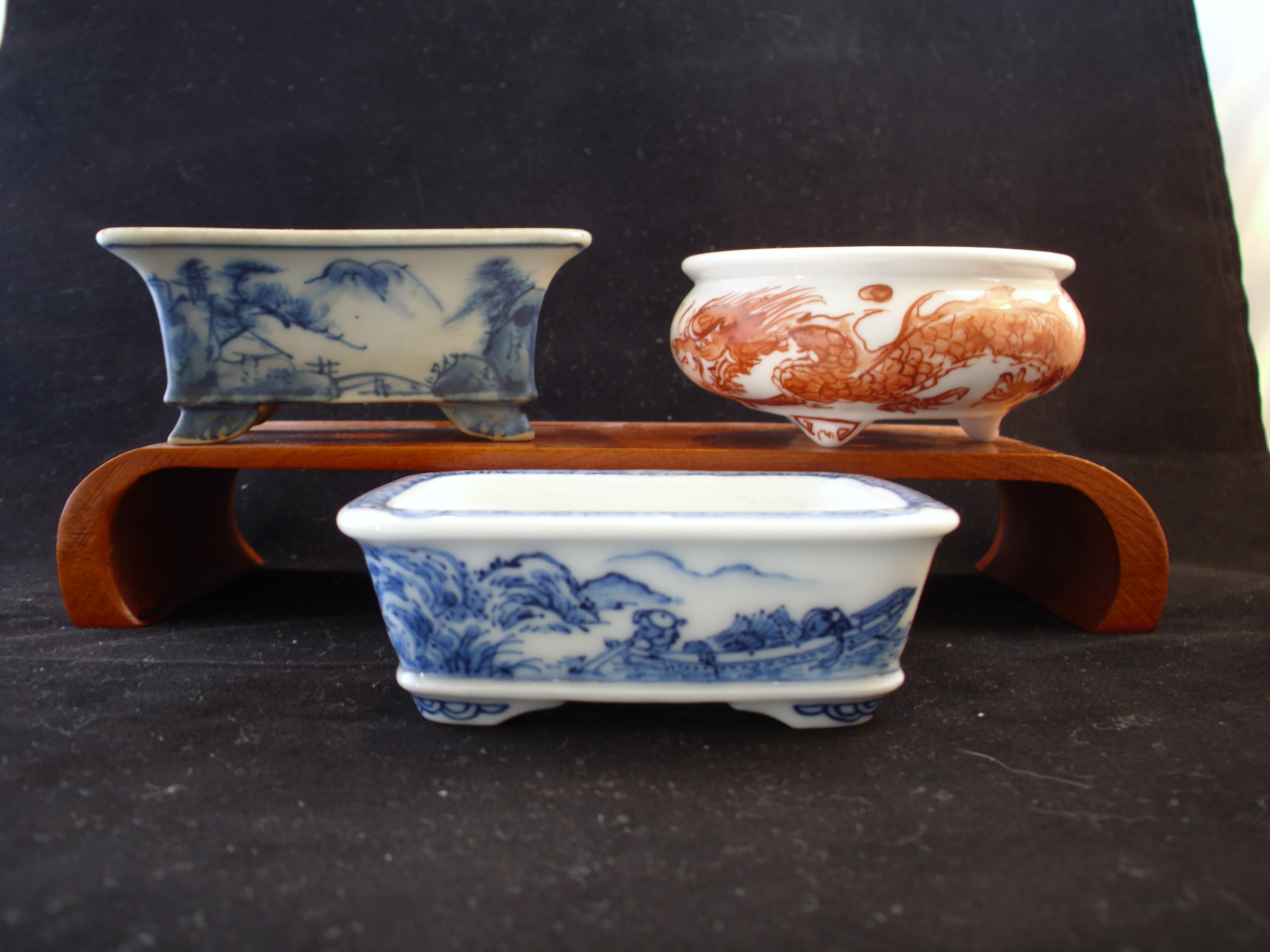 A very nice deep blue glazed oval from Mino Kenzan. Kenzan makes very classical glazed and unglazed pots, never flashy, or even overstated. This makes them highly versatile and useful, as can be seen from the patina on this pot. I like the pots of Kenzan, high usability and better quality than most production line Tokoname. That all of his pots are classical and functional, is, to me, a virtue of this underappreciated potter. After all, is not understatement a virtue when matching a tree to pot?
