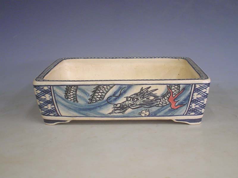 A nice dragon painted pot from Bizan. The style of Bizan is unique and easily identified, with muted blues and overall less bright coloration.