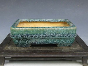 The above 4 pots are typical of Ino’s style of pot with Oribe and green glazes with various other glaze highlights. The silver overglaze speckling on these is an Ino signature move, as we’ve seen in previous posts, a clear homage to Tofukuji. One of my favorite things about these pots, they’re clearly artistic, with myriad coloration and bright splashes, but they never seem to overwhelm the trees that are in them. One can see numerous examples of a host of different species planted in this glaze style Ino pot in Gafu Ten Exhibition books.