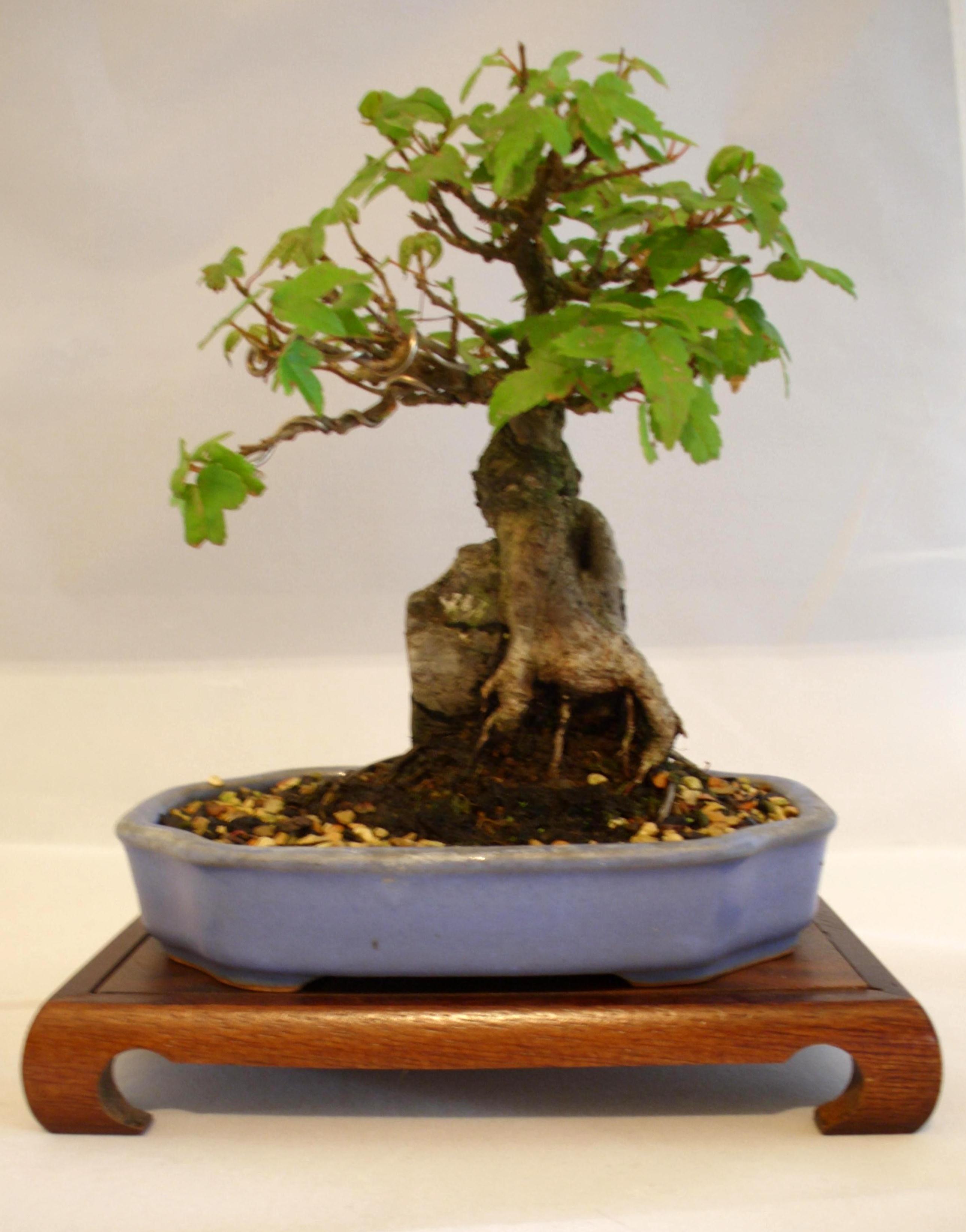 A nice little root over rock Kaede shohin, after a partial defoliation. The goal with this one is ramification and thickening up those roots at the base of the stone. Its easy to see how this ROR was created if you look closely. A band of wire was embedded in the stem of a young tree, which self layered and grew the roots over the stone, after which the original roots were removed. The signs of the girdle are still evident, but will be gone within 2 or 3 seasons with proper care.