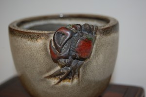 Crab pot with multiple glazes. Zeshin pots where the body of the pot is a crab are very surreal and strange looking...a little evil.