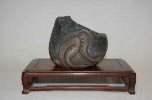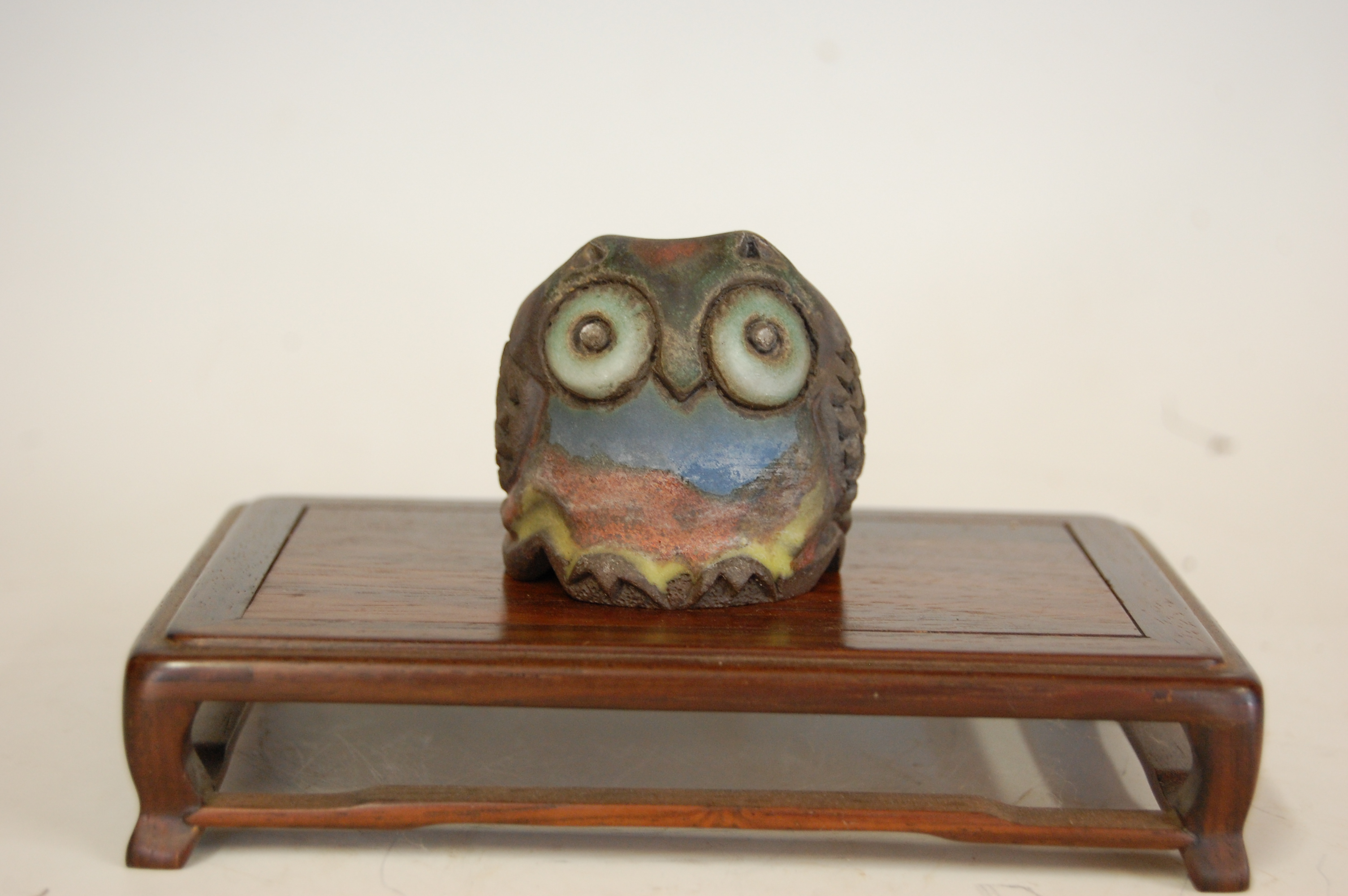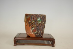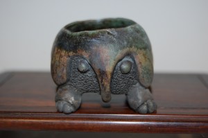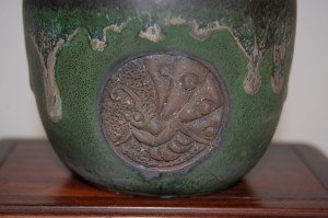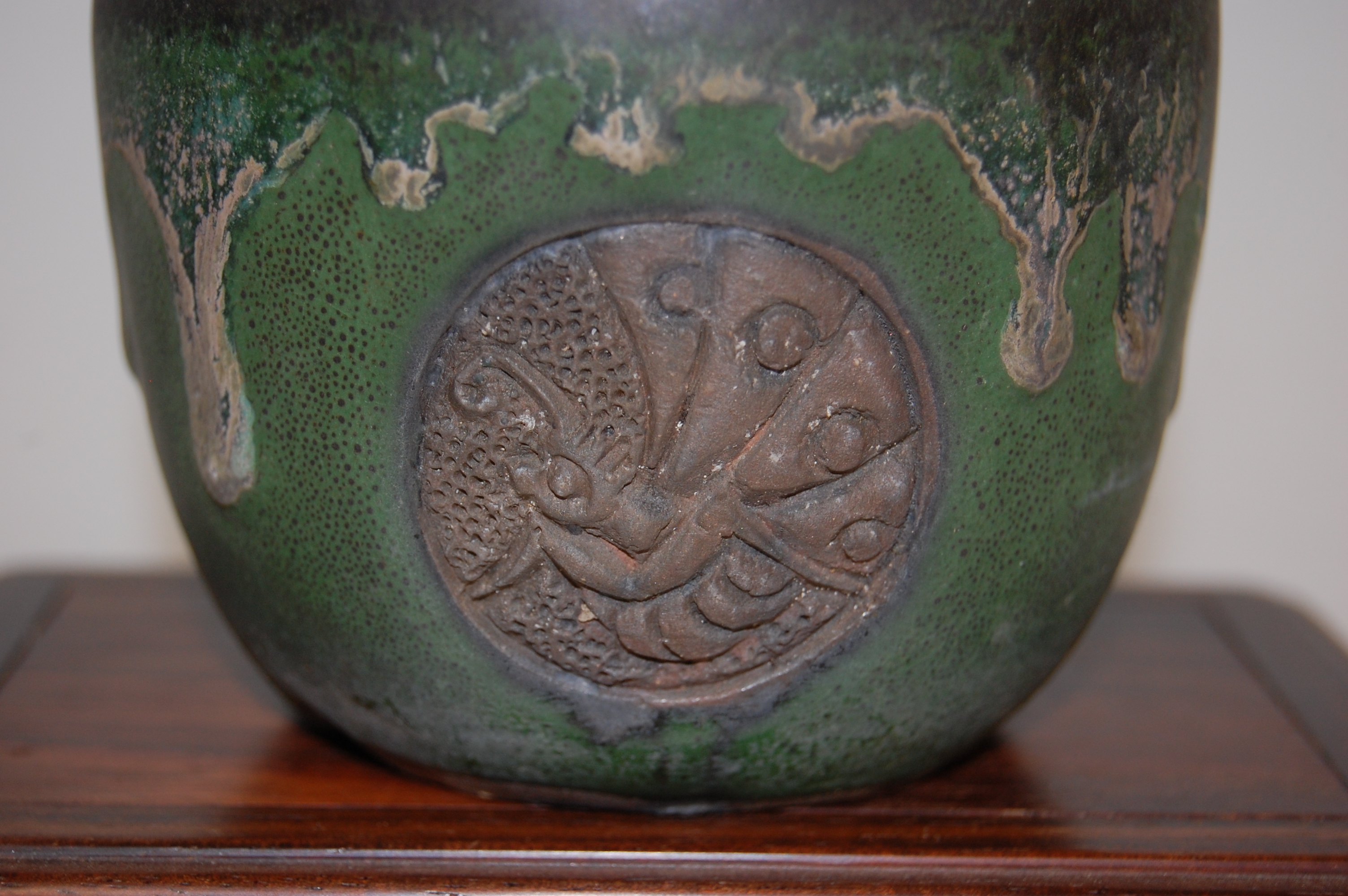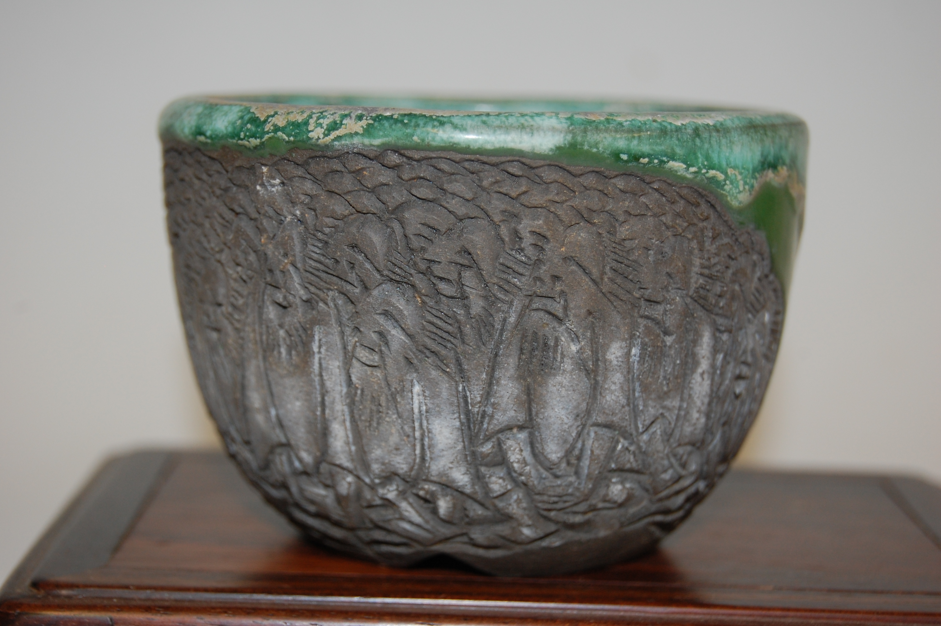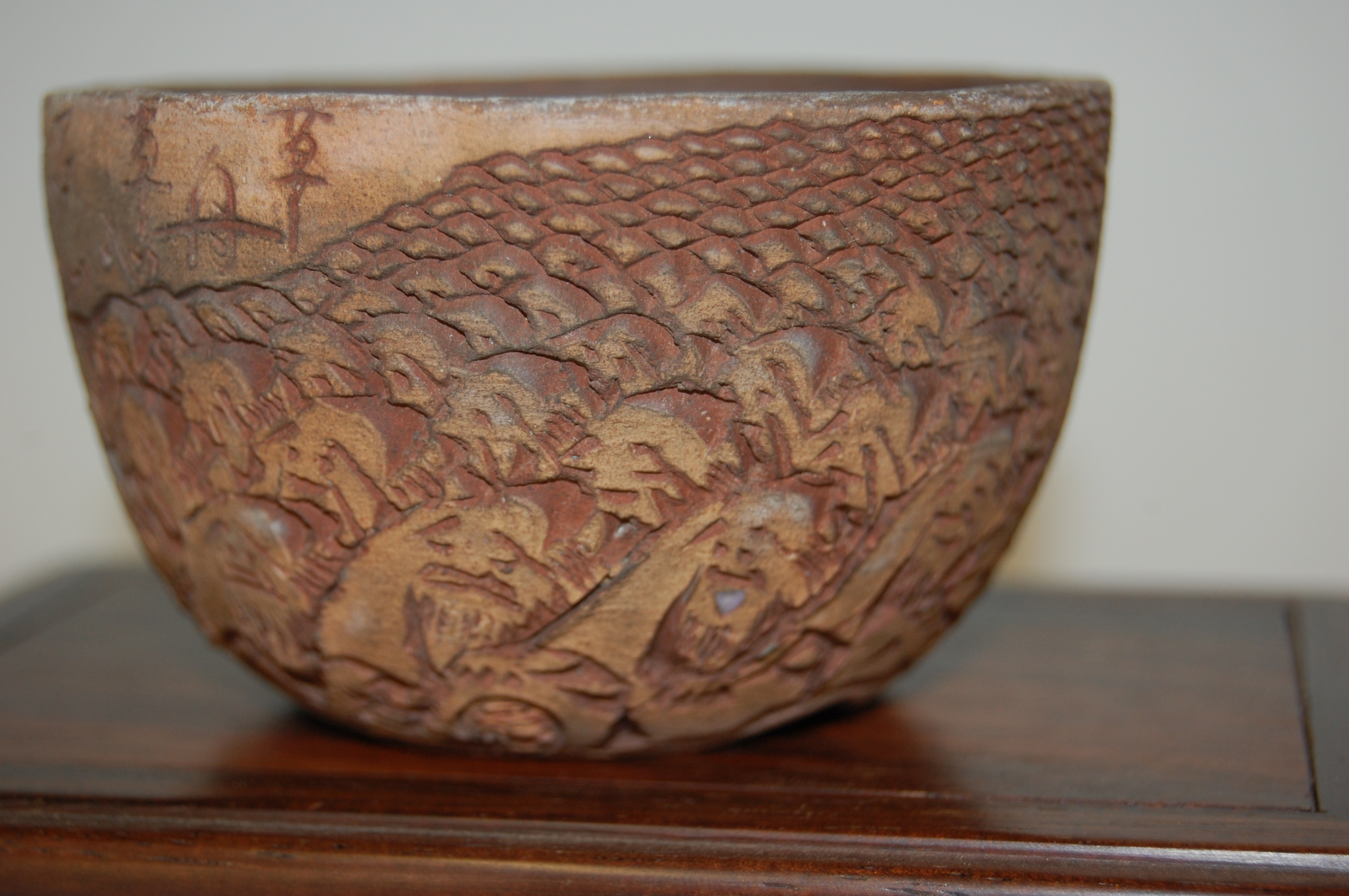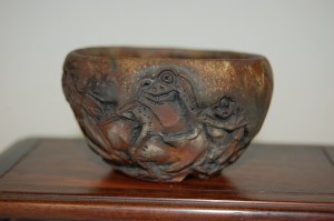 Zeshin is a relatively unknown potter here in the west, but in Japan he is very well known, his pots have been very influential for the current generation of carving potters, and some of his pots fetch very high prices, over $500. His carvings are surreal, strange, trippy, Suessian, and sometimes downright weird. Some of his favorite motifs include “repeating Monks” reliefs, animals(either as a relief, pattern, or the shape of the pot as a whole), especially crabs, frogs, and owl, landscapes, and “freeform wierdness.” His glazes and techniques are every bit as masterful as his carving and pot technique, featuring unique colors with great depth and interesting application.