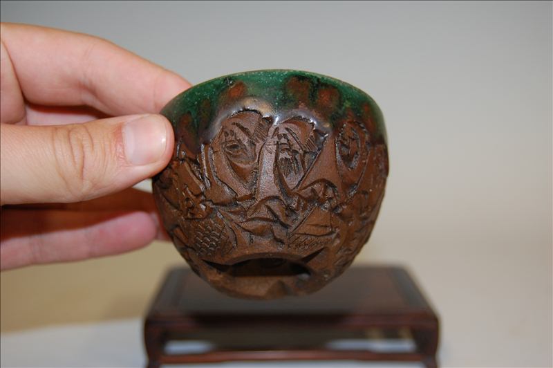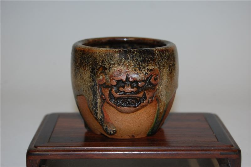 A Great pot with multiple Hankos and carved monks.  I especially like the glaze on this pot, the way it bleeds into the unglazed, carved portion is great.