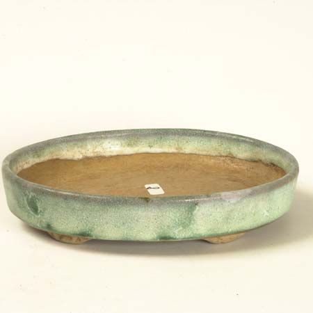 Blue and green glazed oval with cut feet. Brings to my mind the Aurora Borealis.