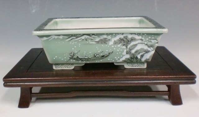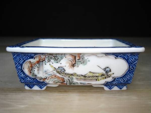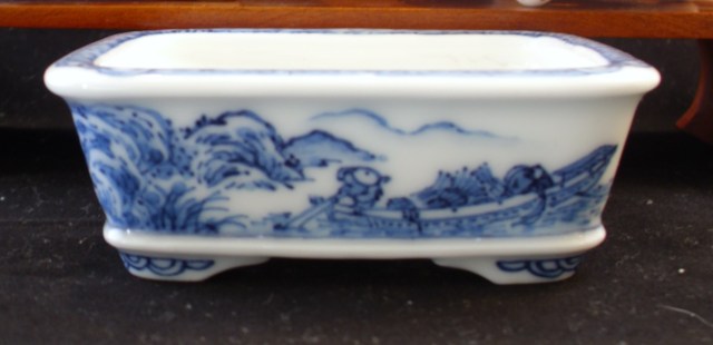 A nice Sometsuke landscape with centered view. Painted bonsai landscape pots will generally have negative space on one side or the other, there to help reinforce the directional movement of the tree. IRilke this pot as it could be used with a tre with movement to the left or right.