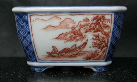 In todays feature we’ll have a look at potter Haruyoshi. One of the modern masters of painted porcelain pots, including sometsuke(cobalt blue underglaze), red underglaze, and five color styles of porcelain painting. Along with Gekkou and Fujikake Yuzan, Haruyoshi is one of the most popular potters of painted porcelain bonsai pottery, and his pots are on the rise in value. At between 1/4 to 1/2 the price of a Gekkou or Yuzan, Haruyoshi pots are still relatively inexpensive, and undervalued for the quality.