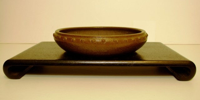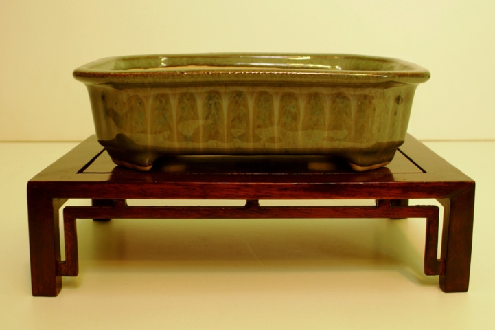 A big wonky glazed pot with carved feet by Eldon A. Leis.  Leis was a bonsai pioneer in Canada, so this wonky little piece carries a bit of Western bonsai history with it.