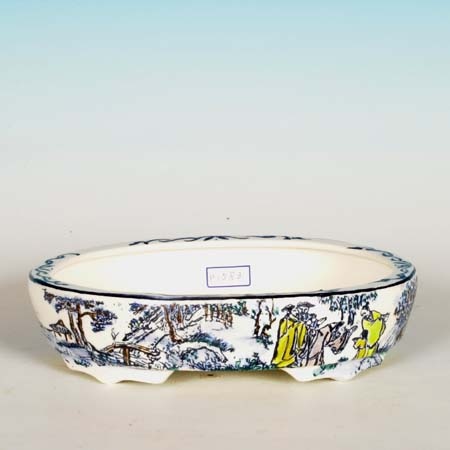This very nicely detailed painting pot is from a very famous Japanese painting by Tawaraya Sotatsu, shown below, and features the god of Thunder from the Shinto religion, Raijin, and the god of the winds, Fujin. You see this image, along with Ando Hiroshiges “53 Stations of the Tokaido,”(Where the small sometsuke above originates) repeated over and over on great painted Japanese Bonsai pottery. Its almost a must that great painters paint a few pots with these images.
