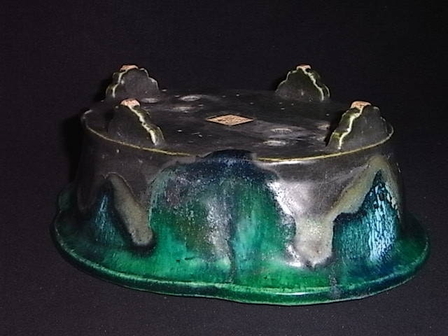 I managed to pick up this Bushuan, Shigeru Fukuda, yesterday, and wanted to share. At 9″, it is much larger than most of the other pots I’ve seen by him, and I think it could easily be considered some of his best work. The lovely wraparound glaze, and marvelous drippy glaze over that, are truly masterful. A wonderful mix of deep blues and greens. The feet and unique drainage holes are cool as well.