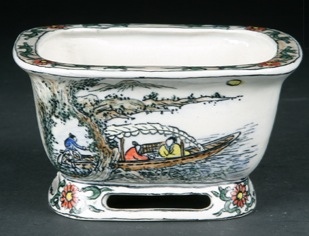 A 5-color window painted pot with very nice brushwork and details. Great use of perspective and depth, the river winds away into the background perfectly!