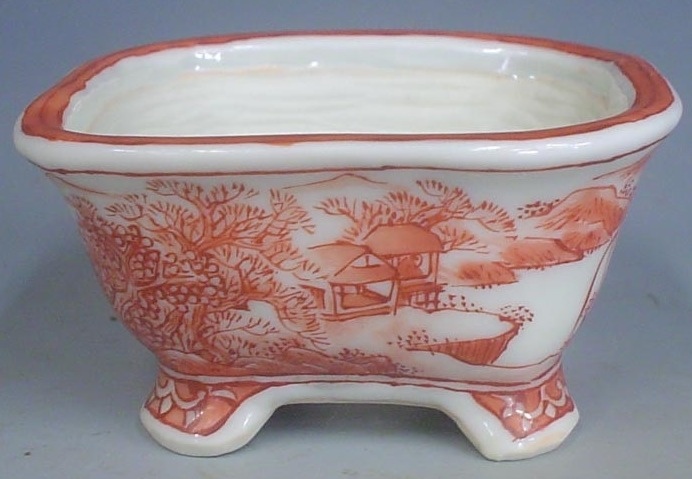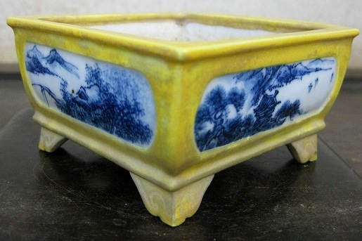 A five color painted landscape, with tall feet. This pot style is common to Yusen pots, and often seen holding lovely deciduous semi-cascades and cascades in the Gafu-Ten shows. Again, marvelous detailed landscape, really great ceramic work.