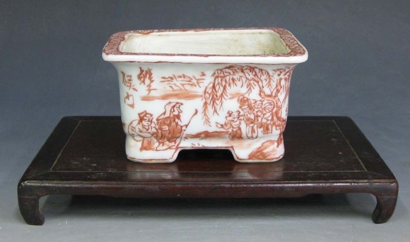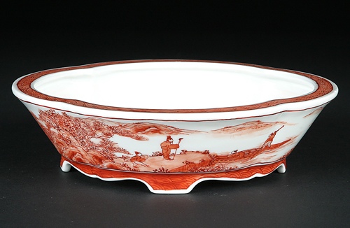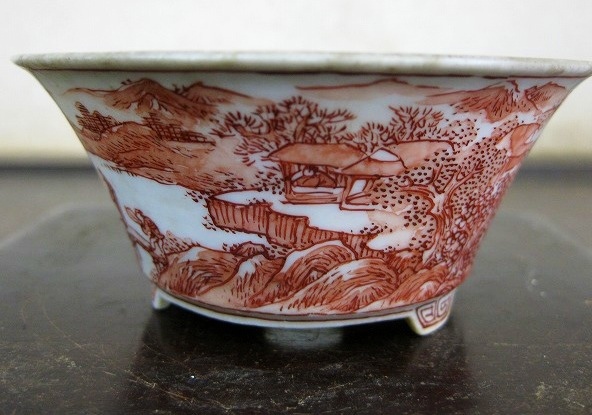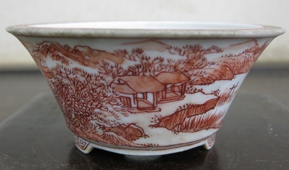 A red painted round porcelain pot, showing some nice patina on the rim. Porcelain patinates at a fraction of the rate of other glazes and unglazed clay, so porcelain pots showing patina are much more valuable and tough to find. This pot is a prime example of why Yusen’s work is prized. Note the detailed brushwork, the full wraparound landscape, the flawless porcelain…gorgeous.