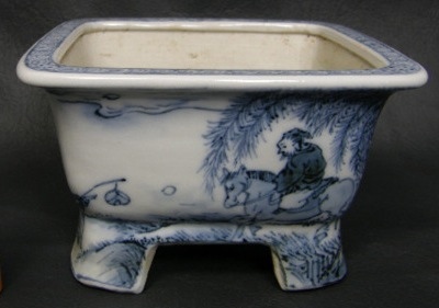 Tsukinowa Yusen lived from 1908 to 1998. At a young age, he moved to Kyoto to study and paint ceramics. He was forced to do hard labor during World War 2, and as a result was in poor health much of the rest of his life. Bonsai was a hobby, and in 1961 he began making pots for his own trees, and as a hobby. Like many other painters of ceramics, some of his best works are copies of famous old paintings, such as Ando’s “53 Stations”.