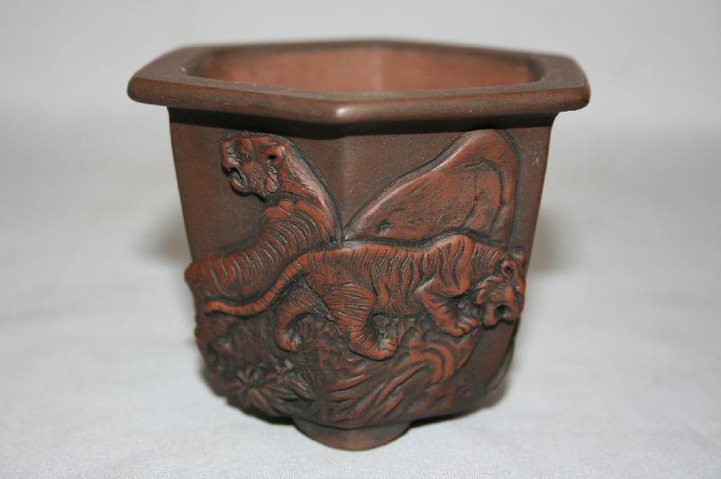 Born March 4, 1925, Yamasyou began full fledged production of bonsai pots in 1975. He is now deceased. He was a bonsai enthusiast for many years before beginning pottery. He is Known for excellent burnishing, lacquering, and finishing techniques, as well as carvings and small statues. Relief work consists primarily of Frog pots, but dragons and crabs are also abundant. Has influenced many modern potters, notably Masahi Furumoto.