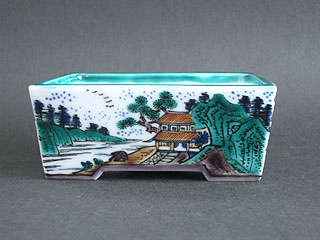A really solid piece. Beautiful details. For the most part, the go-sai reign supreme in Kutani, but in modern bonsai pieces I see more of a movement toward solid reds and blues.