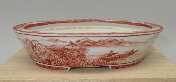 A highly detailed red oval with awesome brushwork. I like the willow to the left, and the negative space to the right, also the rim painting.