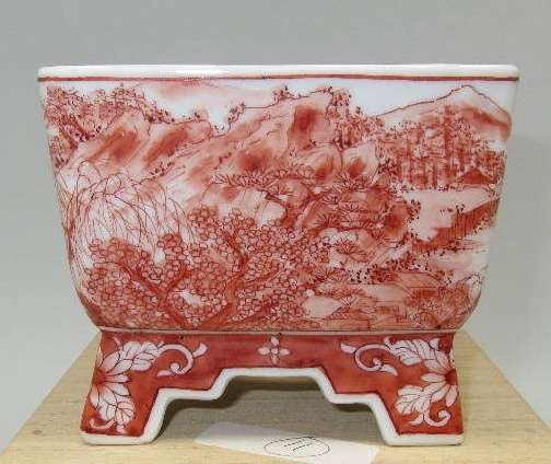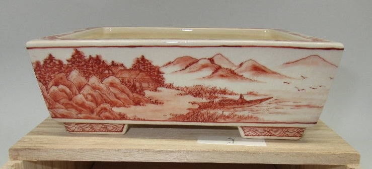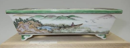 Tsukinowa Shousen was born in 1960. He truly embodies the spirit and skill of his Grandfather, Tsukinowa Yusen, perhaps the greatest painter of bonsai pottery. He has the same attention to detail, and marvelous brushwork of his grandfather, yet uses the different firing techniques of his father, Tsukinowa Shunseki, which are better than those of Yusen, resulting in less kiln flaws and warpage.