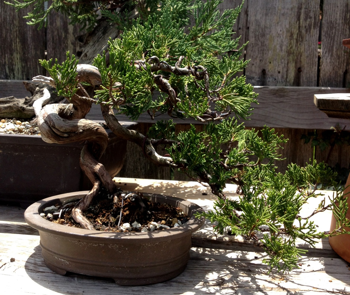 So here’s a problem tree. As it stands, the style is alright, sort of windswept dealie. But with that great old twisted trunk, with the live veins swirling around as they do, I think it could be much better. Any suggestions?