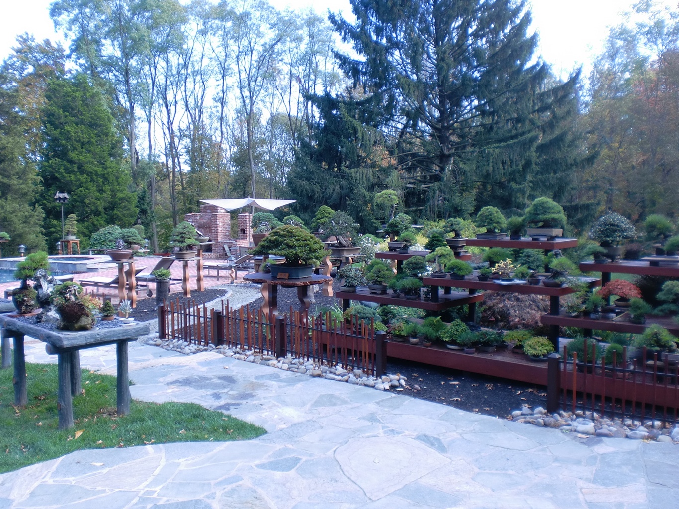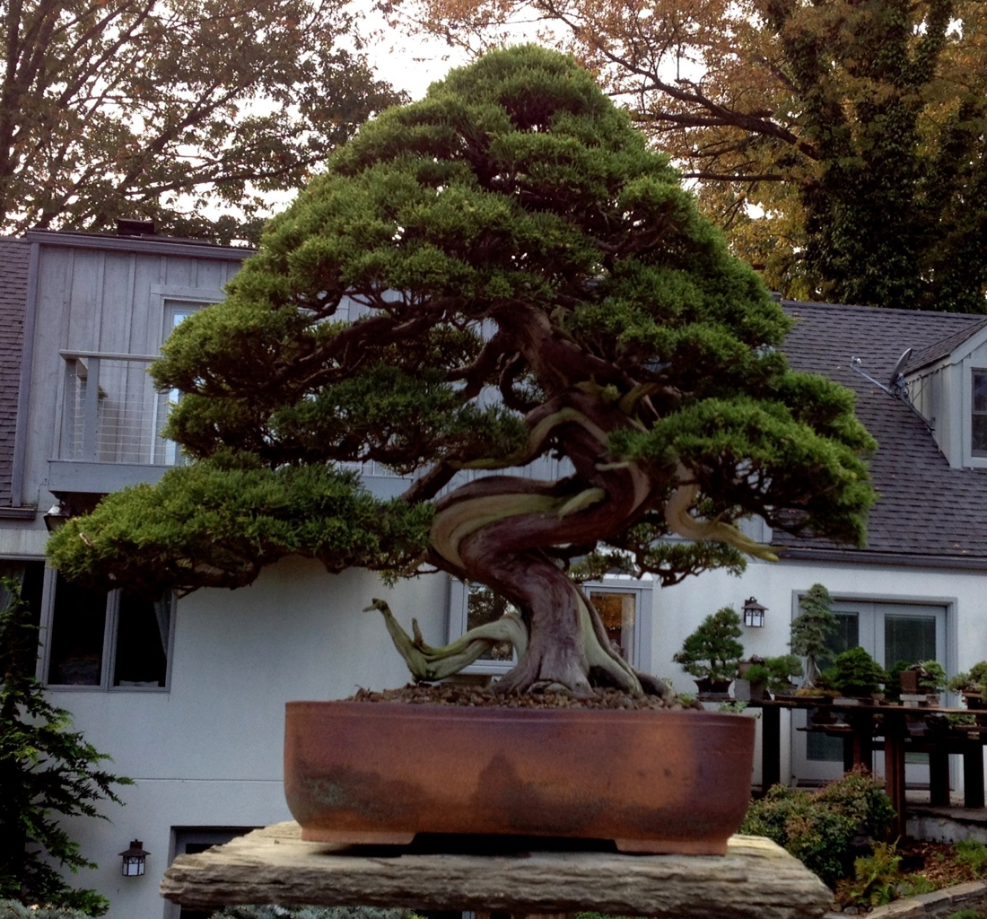 That afternoon we drove to Kennett Square, Pennsylvania. If you are a bonsai enthusiast and dont know where this is going, you must be living under a rock! We were there to visit The Kennett Collection, the private garden and Bonsai of Doug Paul. Well….wow. The gardens are impressively situated on a slope leading downward to the greenhouse area, with Bonsai arranged on plinths and benches, raised shelves and lovely stones, inside arbors and topping the very walls! Some of the wood used to build a few of the benches cost more than all my bonsai! River stone walkways meander through the Bonsai, Sculpture, Koi pond and waterfall, and excellent Niwaki(larger garden trees sculpted and trained like Bonsai). It takes over a half hour just to walk the paths without stopping to appreciate anything! Fortunately, we had time! The Kennett Collection has an impressive variety of species, a good mix of Deciduous and Coniferous trees, in a wide range of styles; American, European, and Japanese species are all well represented. If you ever get the chance, do whatever it takes to see it, I didn’t want to leave!