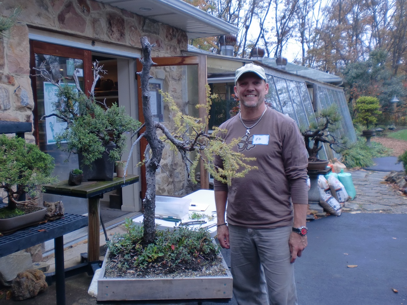 Friday morning brought us to Nature’s Way Nursery, and the soft spoken and very hospitable Jim Doyle. I’d timed the trip to coincide with the first day of Nature’s Way’s annual weekend open house, so my Japanese friends could see an American style bonsai workshop, with collected Larch, and, you guessed it…David Easterbrook. Again, the material was great, and my traveling companions were very interested in the American workshop style, which goes a long way towards showing differences in Bonsai culture(the social kind, not the growing kind) between America and Japan, with amateurs and hobbyists wiring and styling their own trees under the supervision and guidance of a master, as opposed to a master wiring and styling a customers’ tree under the plan and permission of the owner.