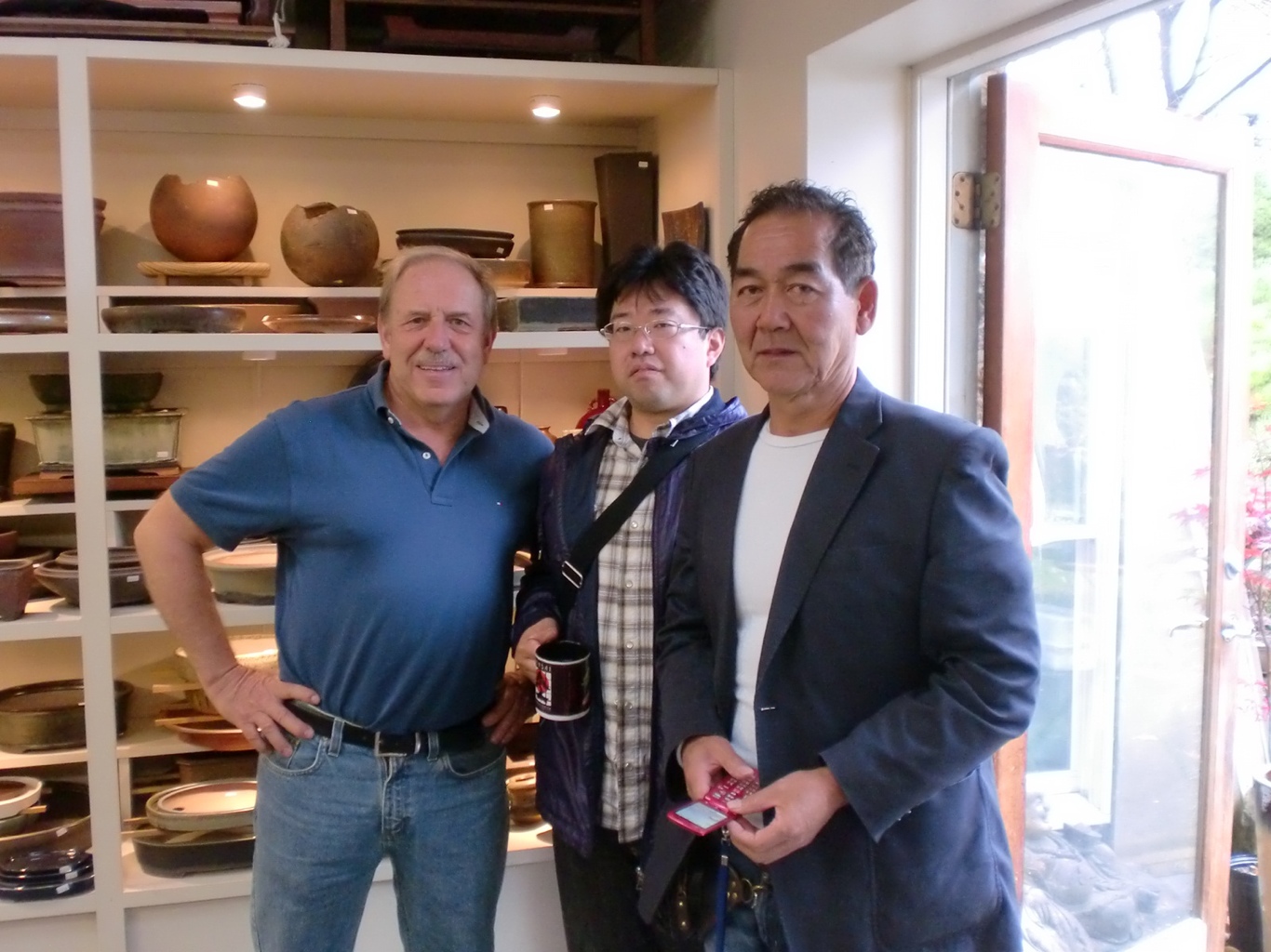 Doug has a wide variety of both Western and Eastern containers holding the bonsai at the Kennett Collection, though American potters take the lions share, and Toriumi and Endo were quite impressed with some of the pieces. They left the Kennett Collection with a real desire to see more American containers and meet some American potters.