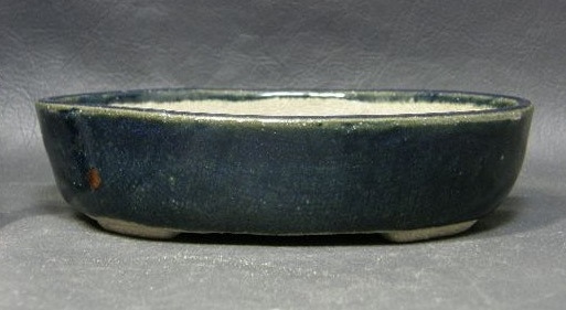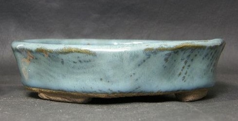 A rustic hand formed blue cream glazed oval. I like the rusticity of this pot.