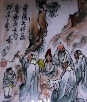 A painted shallow plate by Chazan. This piece exemplifies some of the best of Chazan’s porcelain painting, with the old man figures common in his post war work and the black and gray scale details.