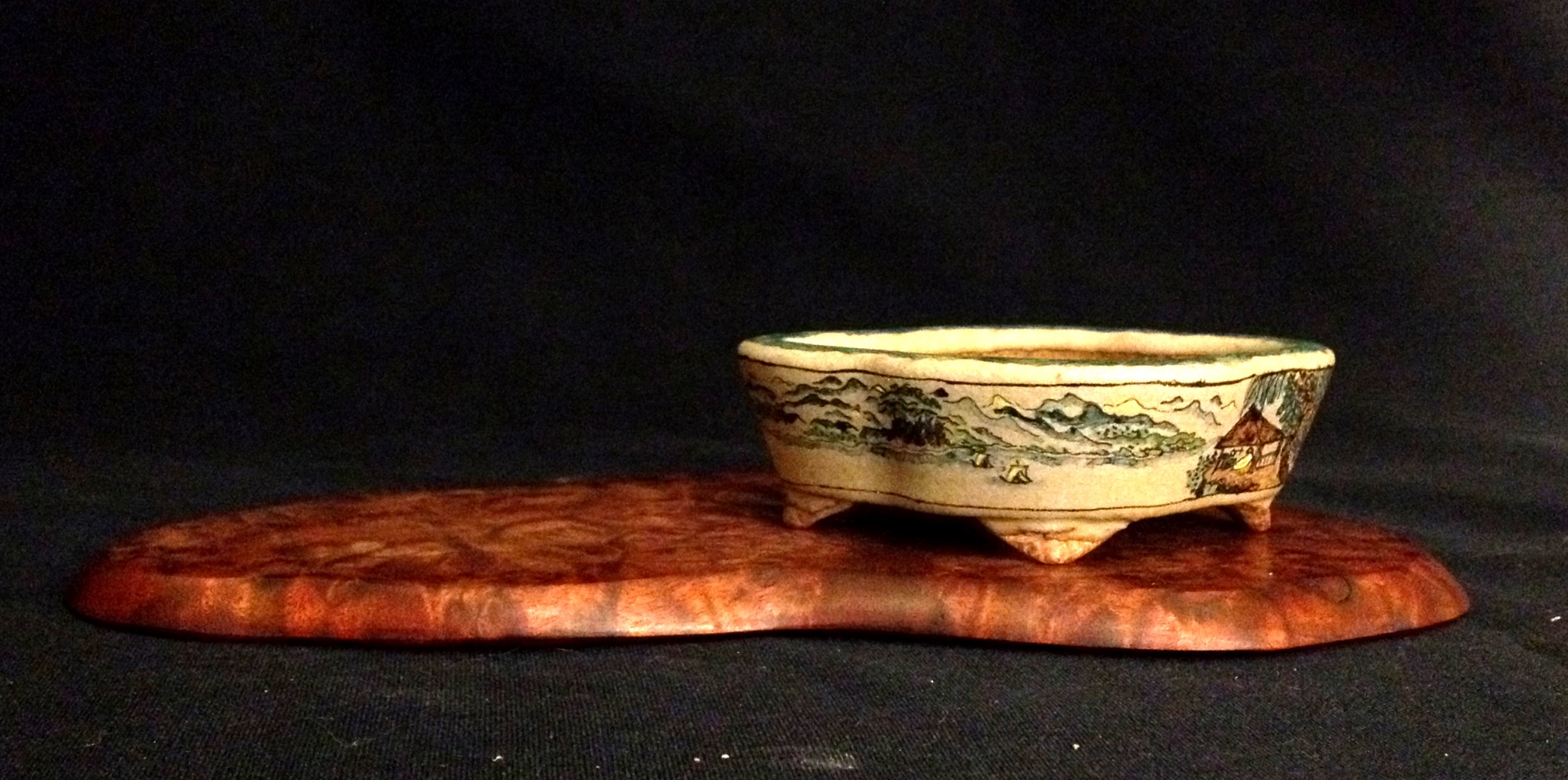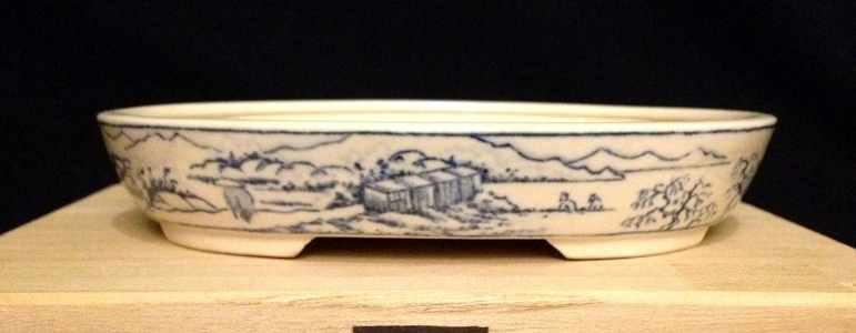 A lipped rectangle sometsuke landscape. The pot is signed, but I’m not sure of the name of the maker, it’s “歌麿”, which I think is “KaMaro”. The kiln is Chinese and pots from it pop up pretty frequently. Around 30-40 years old, like most Chinese unknowns, made by kilns formerly specializing in other wares who began making bonsai pots during the boom years in Japan. The painting is quite nice for an inexpensive pot: the style reminds me of Ito Gekko.