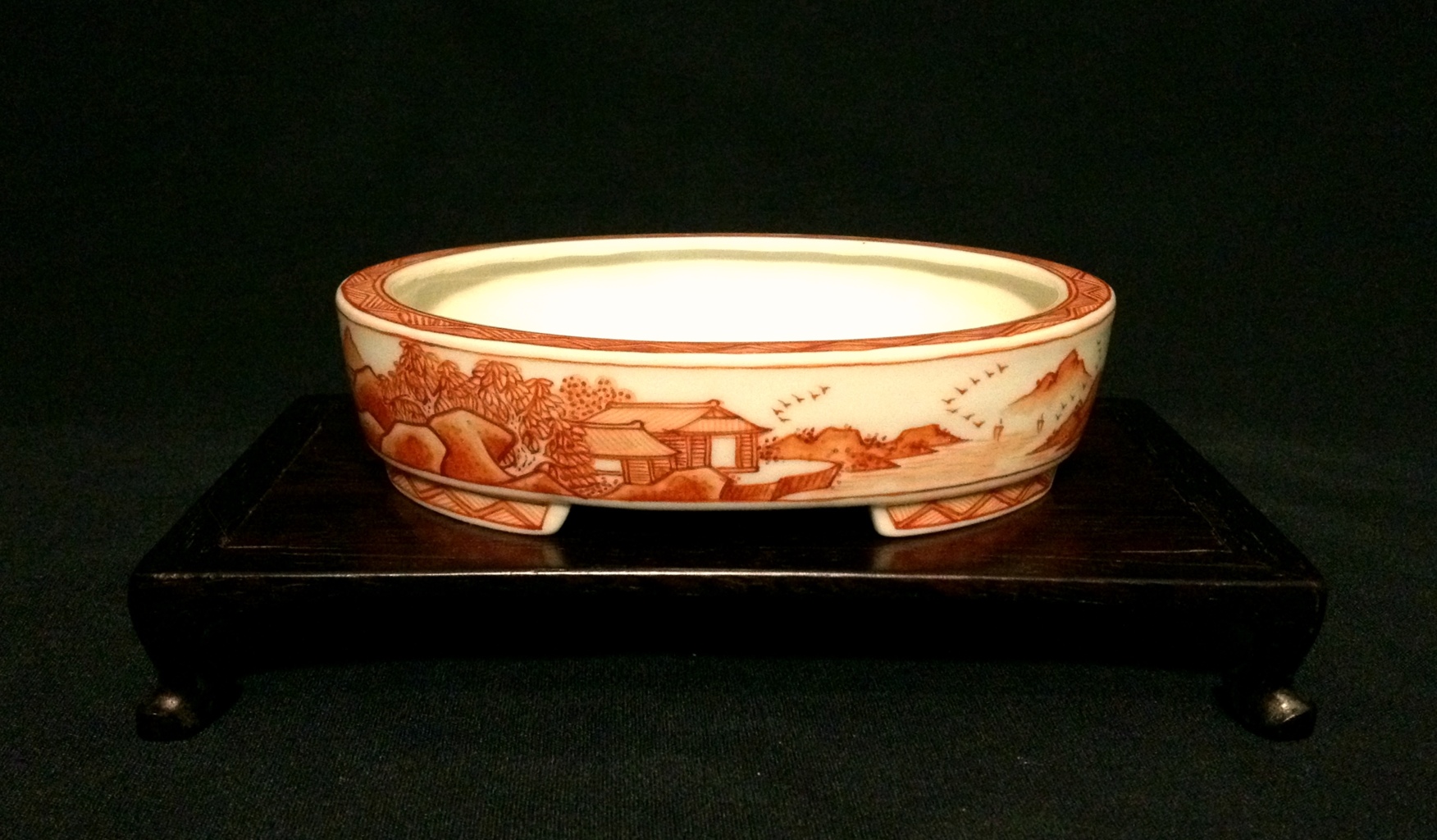 Up first is a small porcelain oval sometsuke by Miyazaki Isseki. One of the top 5 Japanese porcelain painters of Bonsai pottery in the 20th century, Isseki’s work is diverse in shape, style, color, and size. Awesome detail and brushwork for such a small pot.