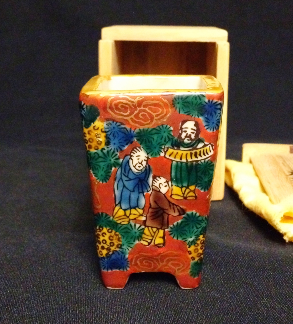 An older Kutani overglaze enamel cascade pot with signed kiri bako and turmeric cloth. Very characteristic Kutani go-sai overglaze work: slightly cartoonish, but charming nonetheless.
