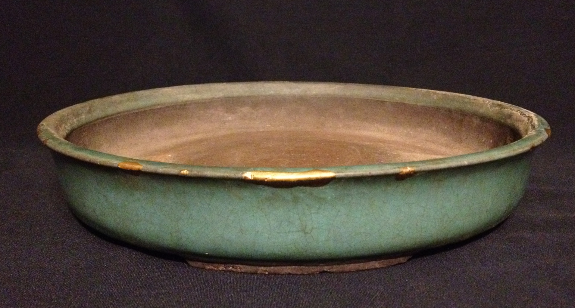 A very old, large blue round with cut feet and gold plate repair from Sansyu Ichiyo. Ichiyo pots are highly desirable and very easily matched with trees, so it’s unavoidable that the vast majority of the ones of usable size have some damage. Ichiyos seem to be especially delicate at the rim, as almost all of the ones I’ve seen over 8″ have some rim chips. The gold repair work done on the chips on this piece is well executed and nice, I have an antique Chinese piece where the plate is flaking off, revealing some type of cement or epoxy. The gold in these repairs feels solid and doesnt scratch easily. The pot has a very nice patina as well, though some scale to one side will have to be dealt with this summer.