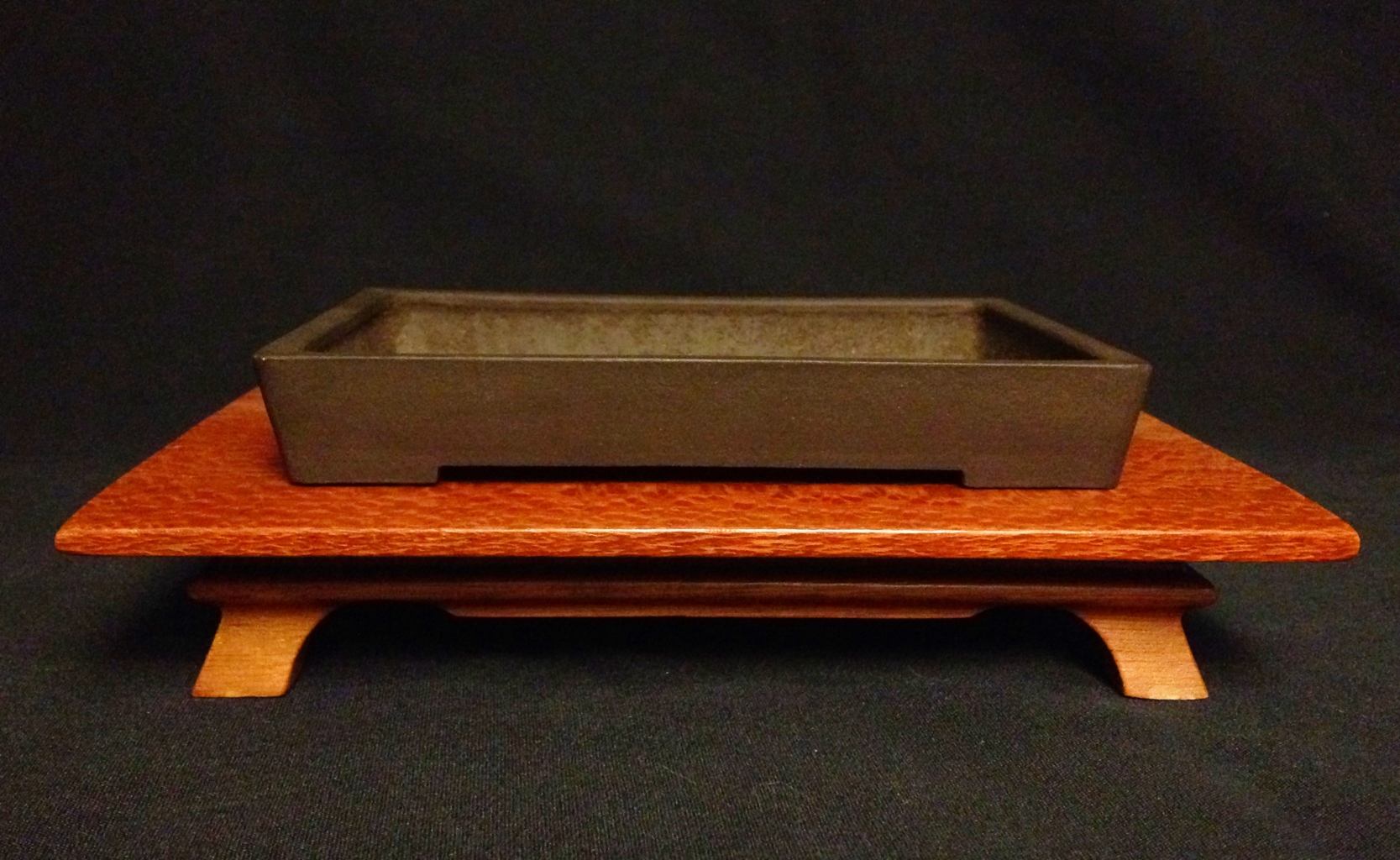 An old black clay classic lipped, cut foot rectangle in dark blue from Aiba Koyo. Very nice patina to this 9″ pot…it’s begging me for a Winterberry or a red Maple!