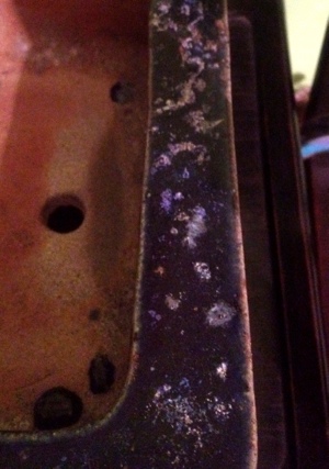 Detail of glaze on rim showing some crystal formation and patina.