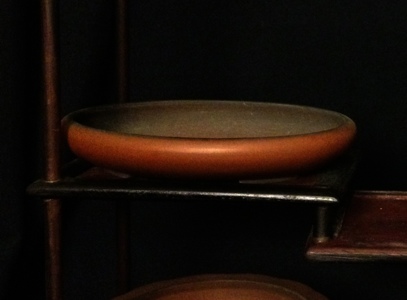 A large Hokido I’ve show before, in his trademark style Antique Mirror shape with three cloud feet. The clay is as rich a red as you’ll see from any potter, for twice to 3 times the price for a 12″ antique mirror shape. Despite selling the ones I had, I still maintain theyre quite the deal for the quality. Well burnished, well shaped, high quality, uniquely tinted clay…what more could you want?