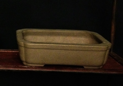 A grayish clay rectangle with cut corners, inset cut feet, and top band. I have another version of this pot that is very early edition, I decided to keep it 🙂