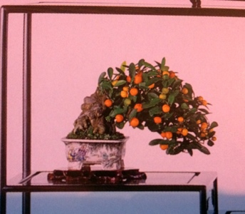 Kinzu, or Dwarf Japanese Wild Kumquat, all in semicascade style. The orange citrus contrasts well with the paintings in the Yusens, and the white of the porcelain provides a good counter for the bright green leaves.
