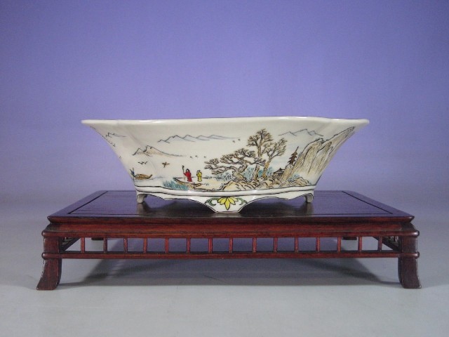 Two sides of a yellow glaze cut corner rectangle with interesting feet and inset landscape windows in sometsuke blue. Clearly Yusen influenced painting style, from the boater looking off to the moon in the distance to the horse and rider landscape scene on the other side…to say nothing of the yellow glaze with inset windows!