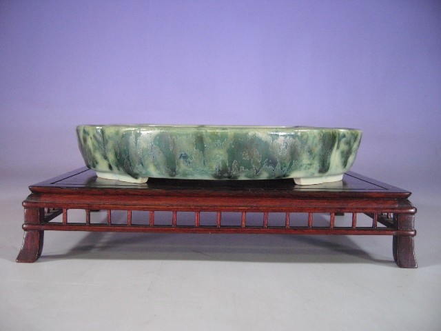 A banded soft rectangle yellow glazed pot with cut feet. I love pure, bright color yellows! You don’t see them in use enough in shohin displays is the states(but then again, you don’t see many great shohin displays in the west, period).