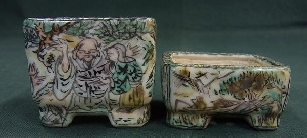 A pair of multi-color painted pots, in Seifu’s signature style. His paintings are a little cartoonish, but charming for it, rather than cheesy.