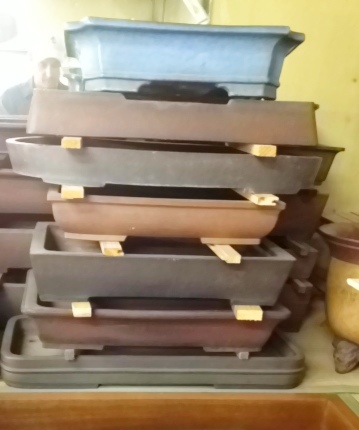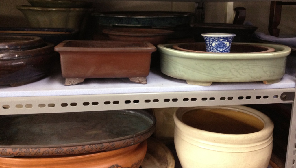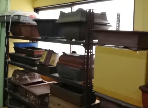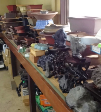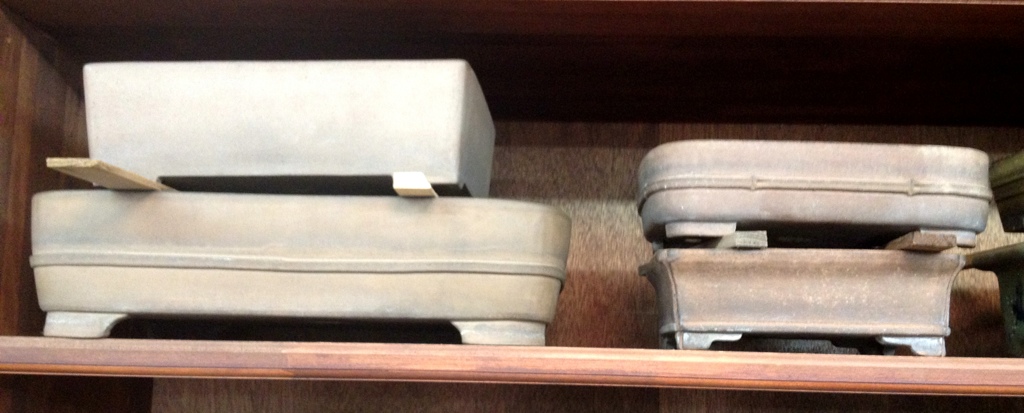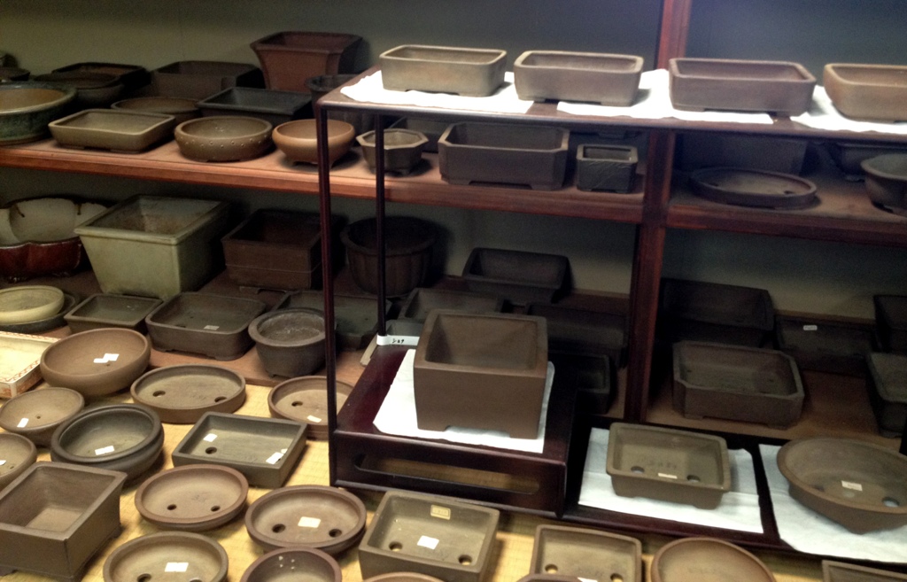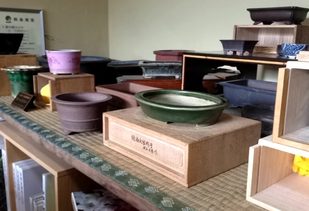 Large glass fronted display case with top quality shohin and chuhin pots. There’s some Ito Gekkou in there, Daisuke, and Yusen, in addition to very nice display objects.