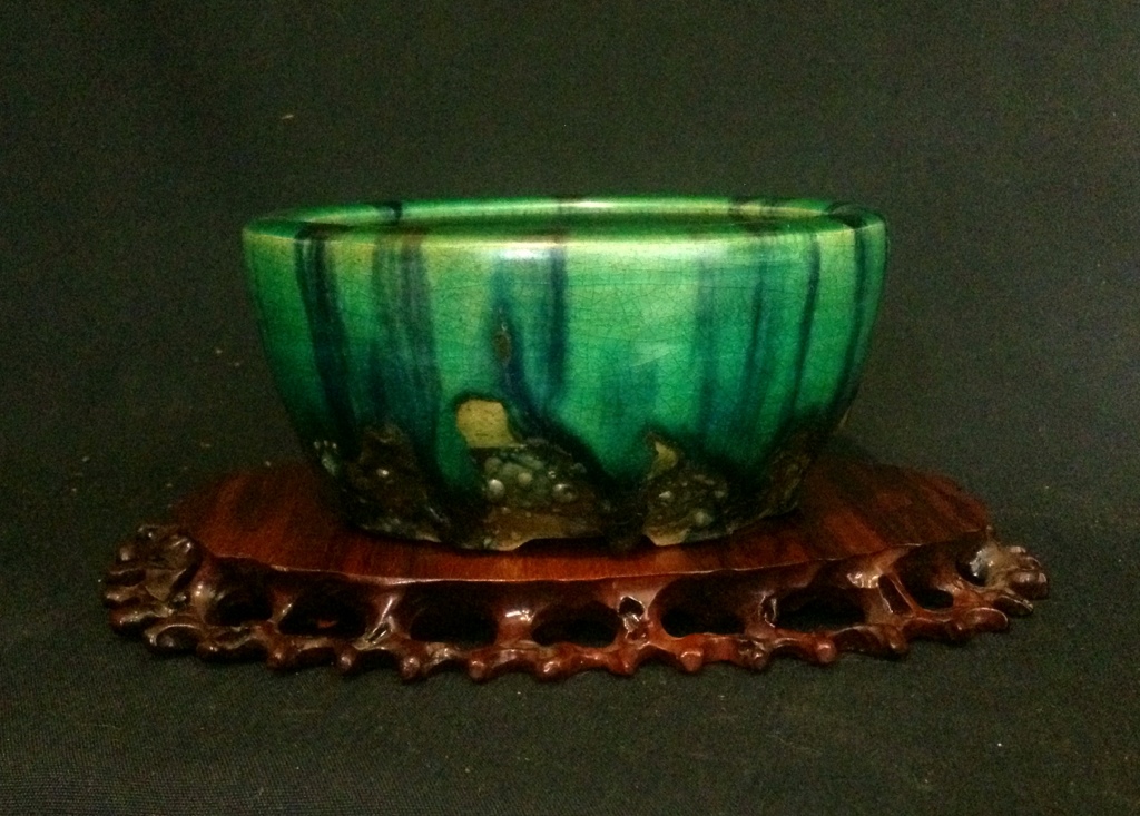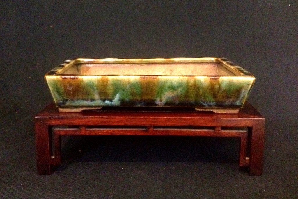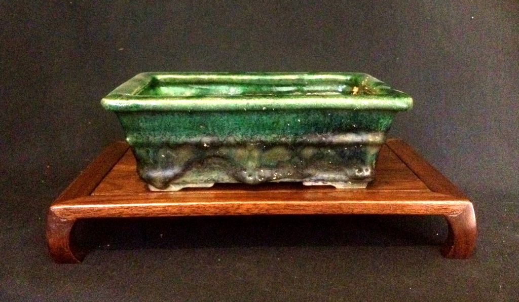 A Shohin sized rectangle with medium blue glaze over light green. Nice asymmetry to the overglaze, and the pot shows a bit of use.
