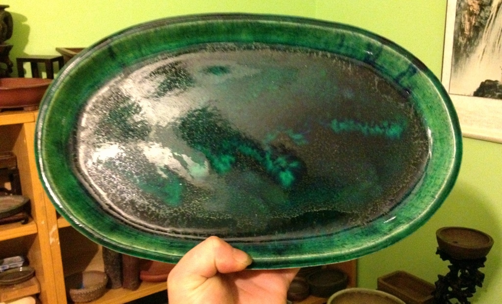 A Shohin sized rectangle low profile pot. A cool mix of colors in this glaze, which has brighter highlights of white than I could capture in a photograph.