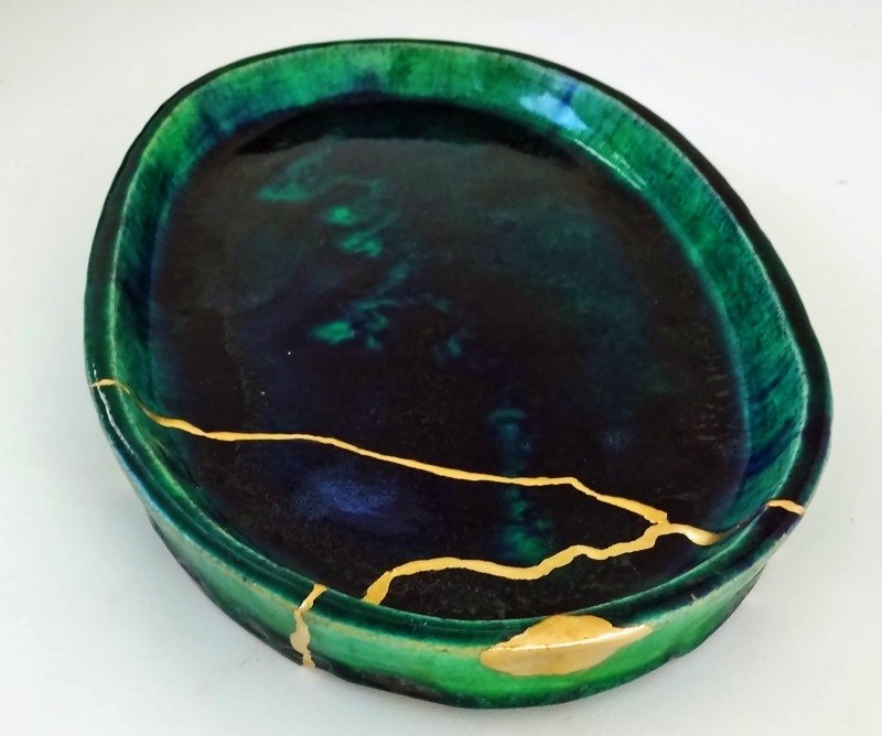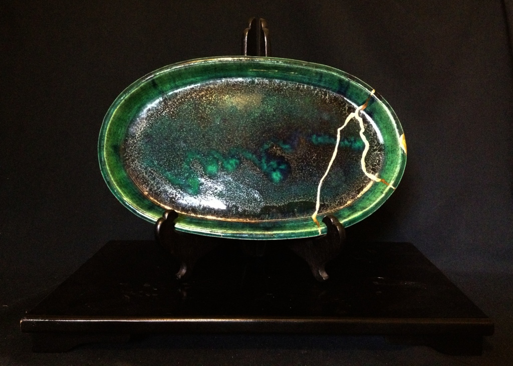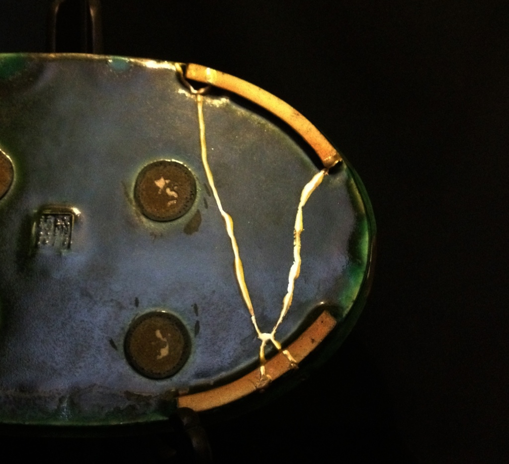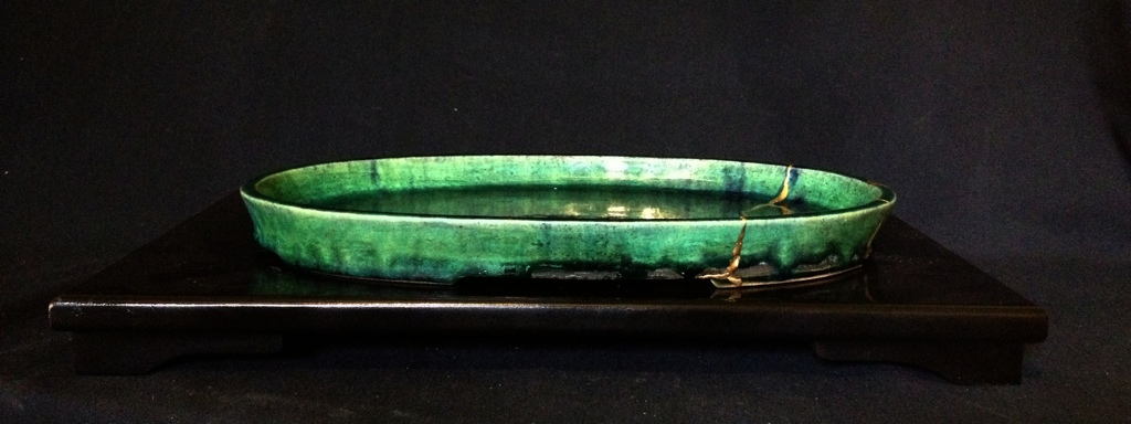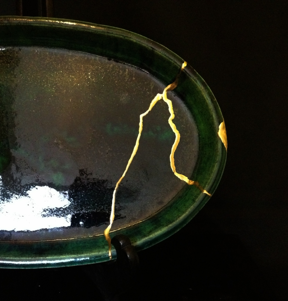 Kintsugi, or Kintsukuroi, means “Golden Repair” or “Golden Joinery”, and, traditionally, is the Japanese art of repairing ceramics with Japanese Lacquer(Toxicodendron sap….volatile stuff. Think Poison Ivy concentrate!) that is then dusted with gold powder. In the best of repairs, this results in pottery that is all the more beautiful for having been broken. The tradition dates back to 15th Century Japan. The possibly apocryphal origin story is that a 15th century Shogun sent a tea bowl back to China for repair, and it was returned with unattractive staples, causing the Shogun to look for Japanese craftsmen who could do better.