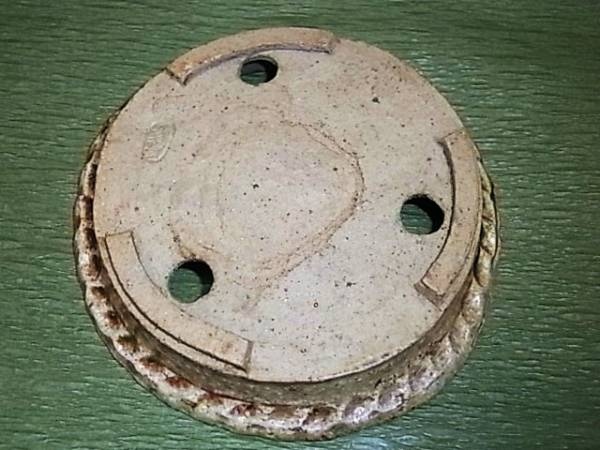 First up, from my collection, this small blue glazed round, riveted drum pot with cut feet. At a glance, I’d say this was real. The patina is excellent, the clay looks kosher, the style is spot on, the glaze is one Tofukuji used extensively, and there’s even a little excess clay on the underside where the drainage holes were cut. All the salient details one looks for are there….