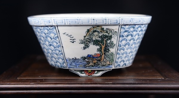 Three views of a sometsuke painted cascade pot by Hosui. Again, very beautiful details and very Yusen-esque.