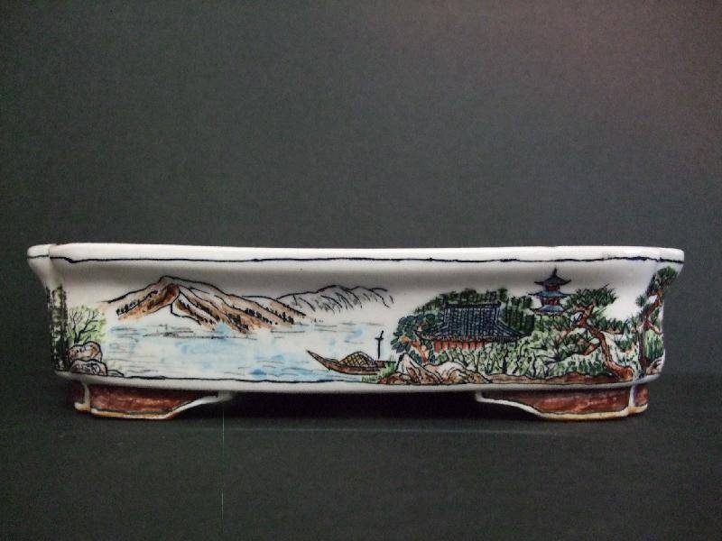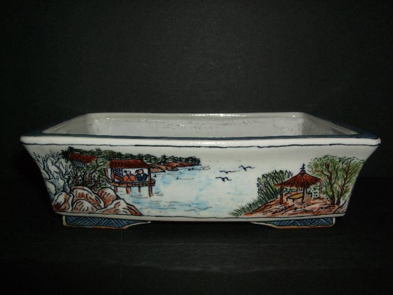 An Akae painted landscape pot from Hosui. Very detailed and lovely landscape work, with excellent negative space.