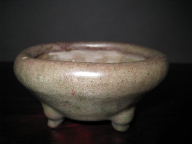 A three footed round with a very thick and deep greenish cream glaze. You can see a slight crackle to the glaze, which barely shows, indicating that this pot was likely never used.
