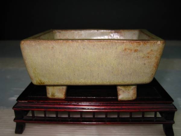 A very classically shaped rectangle with cloud feet and dark green glaze. A simple pot, showing Sanjin’s versatility in both unique and interesting pots an classical simple styles.