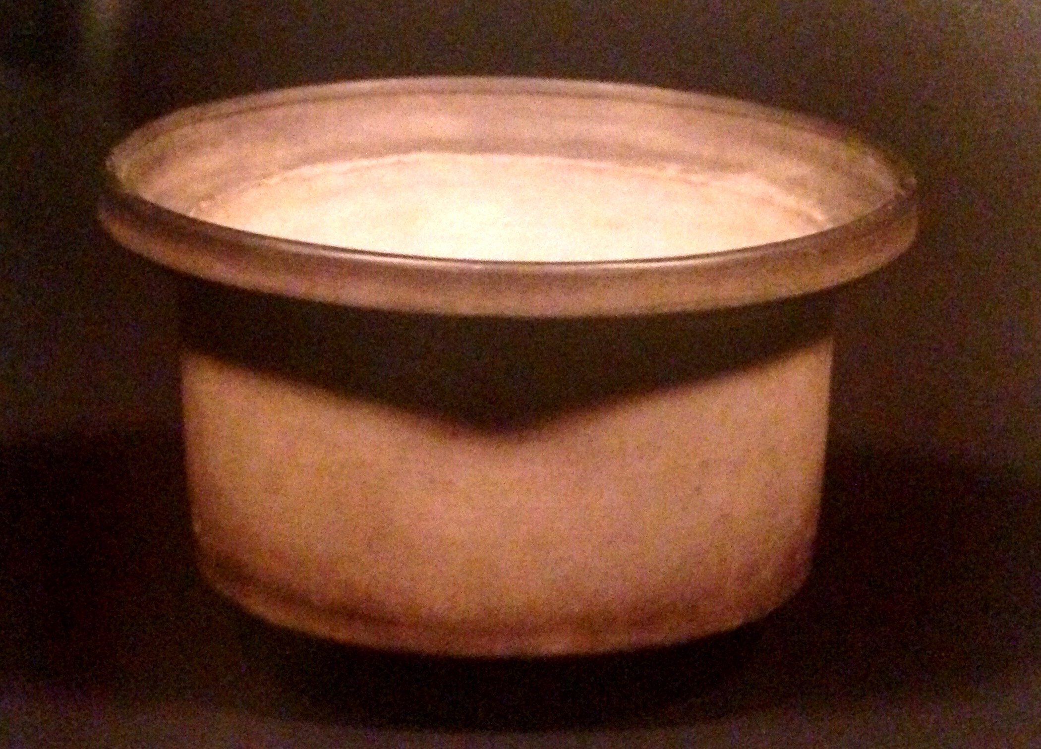 A cream glazed pot with excellent patina. The large lip really makes the pot!